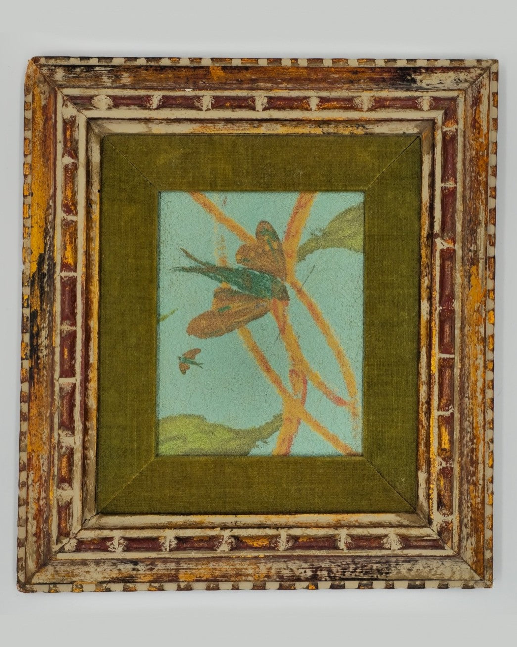 Meander's Moth Dance wallpaper in golden dusk marries old with new in this antique frame with rich green velvet matte.